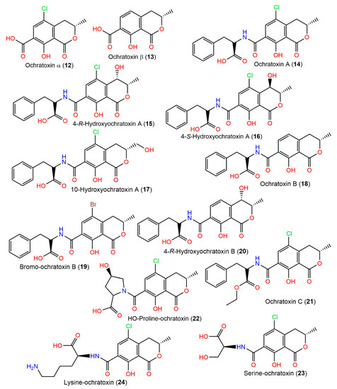 In 1995, ochratoxins 12, 13, 15, 17, and 20 were purified from A. ochraceus NRRL3174 culture and structurally elucidated by HPLC, MS, and NMR (Table 1) [76].