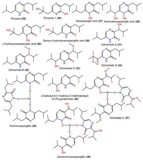 Additionally, from the moldy rice-associated strain, neoaspergillic acid (27) and five related metabolites (25, 28, 29, 30, and 36) derived from leucine were characterized. Ferrineoaspergillin (36) is a red pigment consisting of a complex of iron with neoaspergillic acid [85]. Compound 25 was reported to inhibit NADH oxidase activity with IC50 13 μM by López-Gresa et al. [86]. From the fermentation broth of A. ochraceus LCJ11/102 cultured on a 10% NaI-containing nutrient-limited medium, five new pyrazine derivatives, ochramides A–D (31–34) and ochralate A (37), in addition to the formerly reported 25, 35, and 38, were isolated utilizing Sephadex LH-20 and Rp-18 CC and HPLC, and their structures were determined using NMR and X-ray data. Compounds 31–33 are 7-hydroxy, 7-methoxy, and 7-methoxy and 11-OH derivative of 25, respectively, while 34 possesses peroxide linkage among C11 and C12 and 37 is similar to 38 with an additional 7-methoxy group. Compounds 32, 37, and 38 possess antibacterial potential towards E. aerogenes (MICs 40, 18.9, and 20.1 μM, respectively) compared to ciprofloxacin lactate (MIC 0.93 μM); however, they had no effectiveness versus K562, A549, and Hela cells in the SRB method [22].
