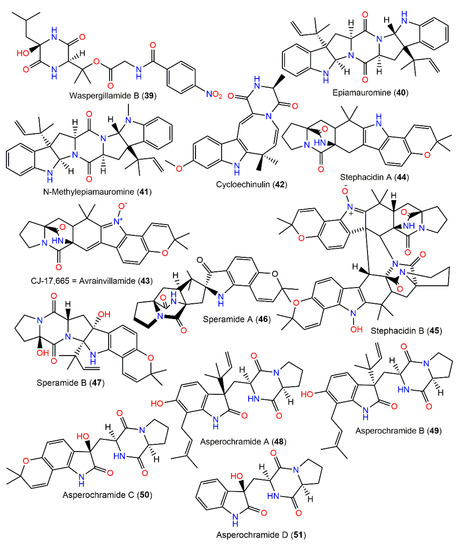 Three new diketopiperazine derivatives, epiamauromine (40), N-methylepiamauromine (41), and cycloechinulin (42), were obtained from A. ochraceus NRRL-3519 sclerotia using Sephadex LH-20 and reversed-phase HPLC and assigned using NMR, whereas their stereochemistry was assured by relying on Marfey’s experiment and alpha D (Figure 4). Compounds 40 and 41 are similar to amauromine obtained from Amuroascus sp. [110], possessing dihydroindole and N-methyl dihydroindole moieties, respectively, whereas 42 features an eight-membered ring and indole moiety. These metabolites revealed moderate weight gain reduction on Helicoverpa zea (corn earworm) with 30, 17, and 33% reductions, respectively, relative to controls after one week [28]. Compound 42, a non-basic Trp–Ala-derived alkaloid was separated from A. ochraceus D2306 mycelia CHCl3 extract by pTLC and characterized by X-ray analysis [87]. A new antibiotic, CJ-17,665 (avrainvillamide, 43), was isolated from the fermentation broth of soil-associated A. ochraceus CL41582 by Sephadex LH-20 CC/HPLC and characterized by NMR tools [88]. This compound is a diketopiperazine metabolite, possessing indole N-oxide moiety. It demonstrated antibacterial capacity versus multi-drug-resistant S. pyogenes, S. aureus, and E. faecalis (MICs 12.5, 12.5, and 25 μg/mL, respectively) in microdilution assay and cytotoxicity towards HeLa cell (IC90 1.1 μg/mL) in the MTT assay [88] (Table 2).