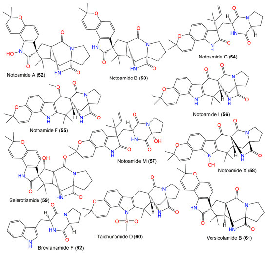 New diketopiperazine alkaloids, asperochramides A–D (48–51), were separated from A. ochraceus EtOAc extract, and the formerly reported 44, 53, 54, 57, 59, 60, and 62 that were elucidated by spectroscopic, ECD, and X-ray analyses (Figure 5). Compounds 50 and 51 are rare indole diketopiperazine alkaloids with a 3-hydroxyl-2-indolone moiety, while 48 and 49 are epimers at C-3, with 3R/11S/17S and 3S/11S/17S, respectively. These metabolites were assessed for their anti-inflammatory potential using the LPS-stimulated murine macrophage RAW 264.7 cells model [90]. Furthermore, 44, 48, 57, 53, and 60 prohibited IL-1β (% inhibition ranged from 36.8% to 49.2%, concentration of 20 μM), while others had lower than 30% at a concentration of 20 μM. Meanwhile, 44, 48, 53, 51, 54, 59, 60, and 62 showed TNF-α inhibition (% inhibition ranged from 32.6% to 41.9%, at a concentration of 20 μM), whereas 50 and 57 exhibited lower TNF-α inhibition ratios than 30% at the same concentration. Hence, 44, 48, 53, and 60 revealed potential anti-inflammatory capacity [90]. Furthermore, notoamides A (52), B (53), I (56), M (57), and X (58) and sclerotiamide (59) were characterized from deep-sea fresh-water A. ochraceus that had no notable anti-H1N1 virus, anti-food allergic, antimicrobial, and anti-inflammatory capacities [80].