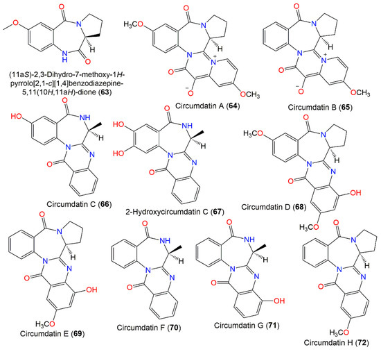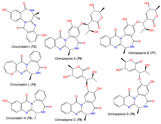 New benzodiazepine-related metabolites, compounds 68–70, in addition to the known 64–66, were separated from an A. ochraceus terrestrial strain obtained from milosorghum seeds using UV-vis/HPLC analysis and characterized using various spectral analyses (Figure 6). Compound 68 is a C-5 methoxy circumdatin E (69), while 70 lacks an OH group at C-5 in circumdatin C (66) [92]. The benzodiazepine core of 66 and 70 was formed from L-proline and substituted anthranilic acid, while that of 64, 65, 68, and 69 has L-alanine instead of L-proline [91].