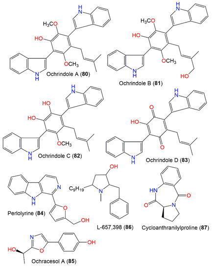 Chromatographic investigation using SiO2 and Sephadex LH-20 CC of anti-insectan A. ochraceus NRRL3519 sclerotia EtOAc extracts yielded new prenylated bis-indolyl benzenoid metabolites, ochrindoles A–D (80–83), and a new bis-indolyl quinone, ochrindole D (83) (Figure 8). These metabolites display a central ring-linked prenyl sidechain. In feeding assays, they had moderate effectiveness (concentration of 200 ppm w/w) towards Carpophilus hemipterus (dried fruit beetle) and H. zea, whereas 80 caused a 20% and 30% weight gain reduction, respectively [29]. These compounds also had potential versus B. subtilis (inhibition zone 15–18 mm, concentration of 100 μg/disk) in the disk assay. It is worth mentioning that these compounds were found to be the main components of A. ochraceus NRRL3519 sclerotia; therefore, they could be accountable for the anti-insectan potential of the A. ochraceus extracts [29]. Perlolyrine (84), a β-carboline alkaloid with a 5-hydroxymethyl substituent in the C-1 linked furan ring, was reported from A. ochraceus MCCC3A00521 culture by Hu et al. [24]. Furthermore, A. ochraceus ATCC22947 yielded a novel pyrrolidine antibiotic, L-657,398 (86), that was separated from mycelia EtOAc extract by SiO2 and Sephadex LH-20 CC and elucidated by various NMR spectroscopic data. This metabolite is related to anisomycin, an anti-protozoal and antifungal metabolite produced by Streptomyces roseochromogenes and S. griseolus [111]. Compound 86 also possessed marked broader efficacy towards yeasts and filamentous fungi than anisomycin using the disk diffusion method [93]. Ochracesol A (85), a new alkaloid, featured an oxazole ring linked to p-OH-disubstituted benzene. Its 17R configuration was assigned by X-ray and ECD analyses. This compound had weak anti-Parkinson’s potential (EC50 17.84 μM) [24].