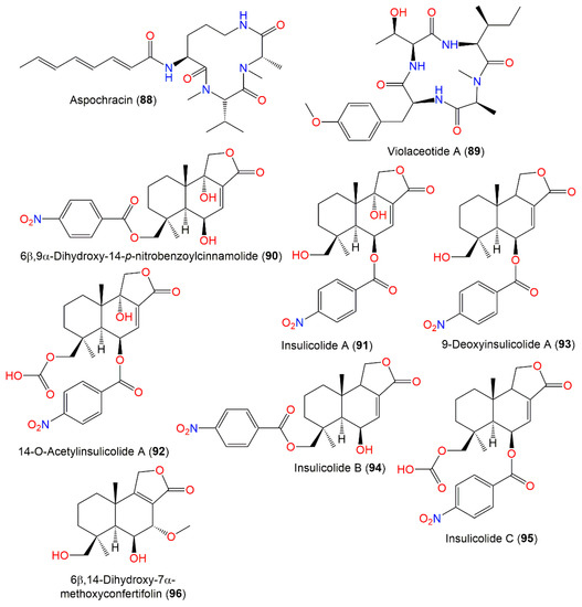 Benzodiazepines are psychoactive metabolites that are naturally reported from Streptomyces, Aspergillus, and Penicillium [91,92]. These metabolites are renowned as a chemotaxonomic marker for this fungus [26,86].