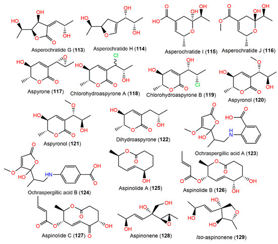 The investigation of A. ochraceus MA15 obtained from marine mangrove Bruguiera gymnorrhiza rhizospheric soil resulted in three new metabolites: asperochrins A–C (104–106), along with the formerly separated 97, 98, 100, 101, and 118–121. They were elucidated using NMR, CD, and Mosher’s methods. Compounds 104 and 105 featured α,β-unsaturated γ-lactone, while 106 had α,β-unsaturated δ-lactone moiety. They possessed no activity towards Artemia salina in the brine-shrimp lethality test. Meanwhile, 97, 100, 104, 118, and 119 revealed selective antibacterial potential (MIC ranged from 0.5 to 64.0 μg/mL) versus V. harveyi, V. anguillarum, and A. hydrophilia, whereas 97 and 104 were the most powerful metabolites (MICs ranged from 0.5 to 32.0 μg/mL). It was revealed that increased OH groups elevated activity and the terminal C-6(7) double bond (e.g., 97 vs. 98) was substantial for the activity [71].