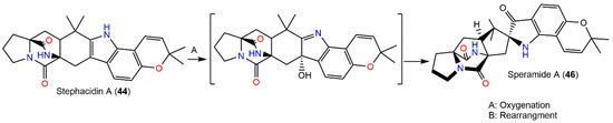 Biosynthesis pathway of speramide A (46) from (+)-stephacidin A (44) via oxidation and rearrangement [23].