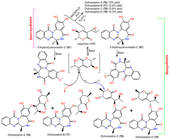 Semisynthetic and biosynthetic pathways of ochrazepines A–D (76–79) [31].