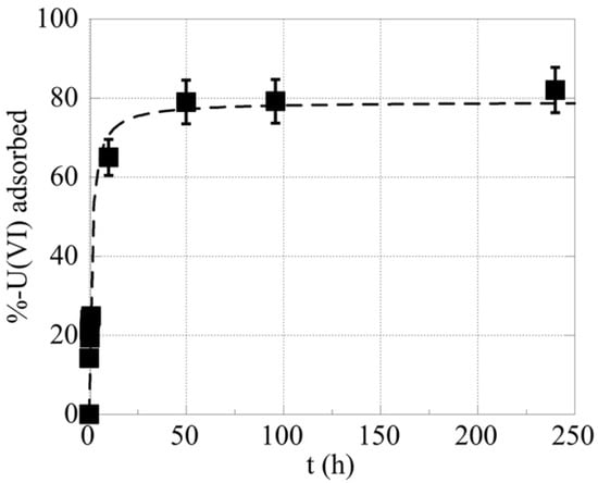 The effect of contact time was studied in order to evaluate the time needed to reach equilibrium in the system. The corresponding kinetic data are summarized in Figure 1 and indicate that equilibrium was reached after almost two days. Hence, the following experiments were performed after three days of contact time to assure equilibrium conditions. Compared to studies using higher uranium concentrations [,], in which equilibrium conditions were reached after a few hours of contact time, equilibrium in the sub-picomolar concentration range is achieved at significantly higher contact times (>50 h), because at such low concentrations, the diffusion of the uranium cations from the solution to the biochar surface is the adsorption rate-limiting step.