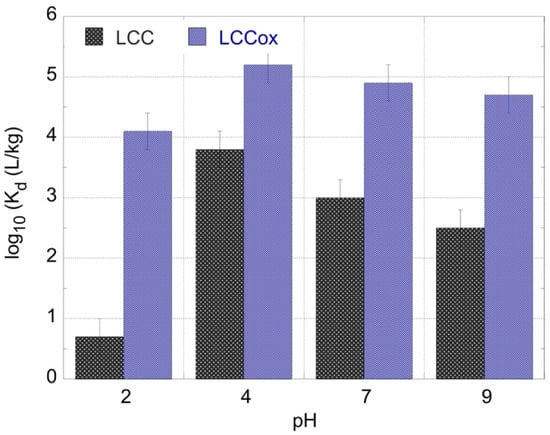 The solution pH was expected to affect to sorption efficiency (Kd values) because the proton concentration determines the U(VI) speciation in solution and the surface charge of the biochar materials. The latter is associated with π-proton interaction [] and carboxylic dissociation [] for the LCC and LCC_ox, respectively. Regarding U(VI), the predominant species in solution at pH 2 and pH 4, pH 7, and pH 9 were expected to be UO22+, UO2CO3, and UO2(CO3)34−, respectively []. On the other hand, at pH 2, the biochar surface carboxylic moieties are extensively protonated (pKa < 4) and partly deprotonated at pH 4. Only at pH 7 and pH 9 are the carboxylic groups extensively deprotonated and the surface negatively charged [].
