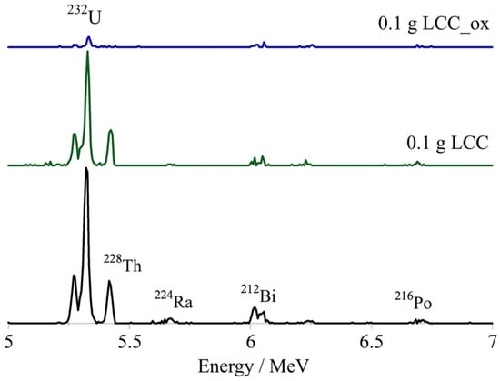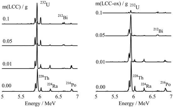 The alpha spectra of the U-232-traced aqueous solutions after treatment with different masses of unmodified (m(LCC) in g) and oxidized biochar (m(LCC_ox) in g). [U-232] = 8.6 × 10−14 mol/L, pH 4 and ambient conditions. It has to be noted that Bi-212, Ra-224, Th-228 and Po-216 are daughter nuclides of U-232 and are therefore present in the alpha spectra.