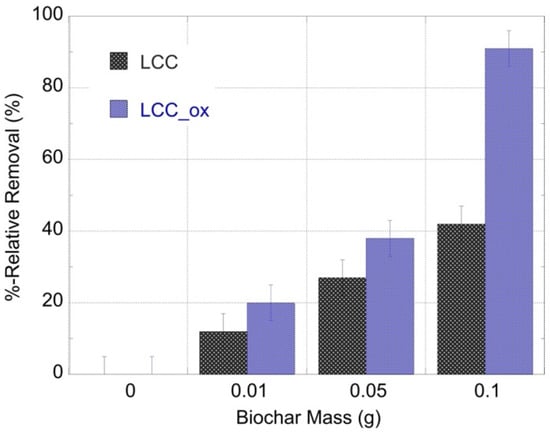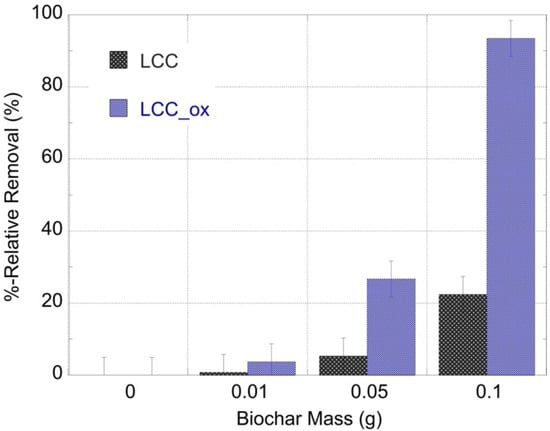 The %-relative removal efficiency of U-232-traced aqueous solutions after treatment with different masses of unmodified (LCC) and oxidized biochar (LCC_ox). [U-232] = 8.6 × 10−14 mol/L, pH 4 and ambient conditions.