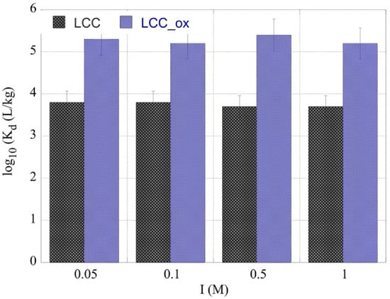 The Kd values for the U(VI) sorption by two different types of biochar fibers (LCC and LCC_ox) as a function of ionic strength. [U-232] = 8.6 × 10−14 mol/L, biochar mass = 0.01 g, pH 4 and ambient conditions.