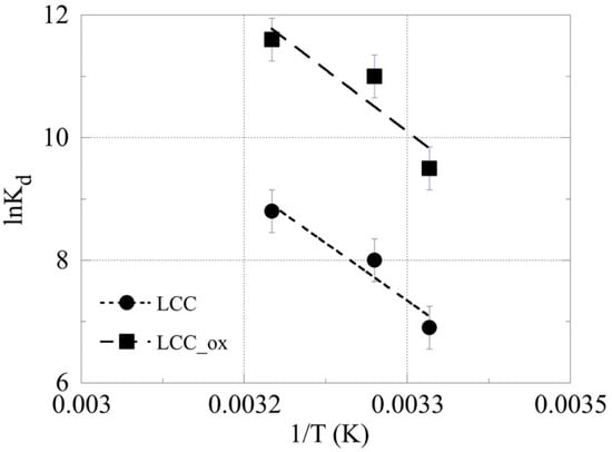 The lnKd −1/T plot is shown in Figure 6; the thermodynamic parameters were calculated using the slope and intercept obtained from the linear regression of the associated experiment, and were found to amount to ΔH0 = 1.4 kJ mol−1 and ΔS0 = 5.4 J K−1 mol−1, and ΔH0 = 1.5 kJ mol−1 and ΔS0 = 6.1 J K−1 mol−1, for the adsorption of U(VI) by LCC and LCC_ox, respectively. These data clearly indicate that the adsorption of U(VI) by both biochar materials is an endothermic and entropy-driven process, and are in agreement with previous studies. However, the values obtained are up to two orders lower than the corresponding values obtained from experiments performed using higher uranium concentrations [,]. This is attributed to the fact that at higher concentrations, the assumption of a large excess of binding sites compared to the metal species is not viable, resulting in those significant differences.