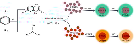 In this experiment, p-phenylenediamine and boric acid or citric acid were used as precursors, and two GQDs were synthesized by the bottom-up hydrothermal method, named o-GQDs (BA was used as the regulator) and c-GQDs (CA was used as the regulator), respectively. The prepared c-GQDs emitted green light under the irradiation of a UV lamp, while the o-GQDs emitted bright orange fluorescence. They had excellent fluorescence performance, good dispersion, and a uniform size distribution. In particular, the o-GQDs were successfully doped with boron to enhance their various properties, and this technique was successfully applied to the detection of Al3+ ions in the subsequent detection of metal ions. The fluorescence quenching of o-GQDs by Al3+ is due to the obvious effect, which may be related to the strong binding and fast chelation kinetics between the N and O functional groups and the ions of o-GQDs. During the chelation process, the separation of the o-GQDs’ photoexcited electron hole pairs leads to rapid electron transfer, which promotes the electron/hole recombination process, leading to the arrest of electron transition, and finally leading to the quenching of the o-GQDs’ fluorescence signal [26,27]. The experimental process is shown in Figure 1.