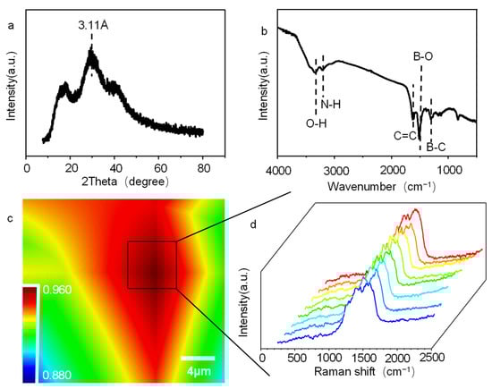The Figure 3a shows the XRD pattern of the o-GQDs. The o-GQDs have an obvious diffraction peak with a layer spacing of 3.11 Å at about 29.6°. In addition, the c-GQDs have an obvious wide diffraction peak near 29.1°, and its layer spacing is 3.05 Å (Figure S1, Supplementary Materials). The surface spacing of o-GQDs is larger, which may be due to the B-doping. Figure 3b shows the FT-IR diagram of the o-GQDs; there is a strong stretching vibration peak O-H bond at 3340 cm−1 [28,29]. Before the infrared test, the sample was completely dried, indicating that the O-H comes from the o-GQDs. There is a strong stretching vibration peak at the N-H bond at 3211 cm−1, and the bond energies at 1613 cm−1, 1515 cm−1, and 1303 cm−1 represent C=C, B-O, and B-C, respectively [30,31,32]. These functional groups indicate that there are many amino and hydroxyl groups on the surface of the o-GQDs, so the o-GQDs have a good hydrophilic property. In addition, B-O functional groups and B-C functional groups were detected, indicating that the boron was well doped into the o-GQDs. Fourier transform infrared spectroscopy of the c-GQDs shows that they have similar groups to o-GQDs (Figure S2, Supplementary Materials). Figure 3d shows the Raman diagram of o-GQDS. The D-peak of the disordered sp3 hybrid carbon structure (1355 cm−1) and the G-peak of the ordered sp2 graphite carbon structure (1523 cm−1) can be clearly observed. The D-peak (1347 cm−1) and G-peak (1550 cm−1) of the c-GQDs can be observed from Figure S3b (Supplementary Materials). The ID/IG ratio of the o-GQDs is higher than that of the c-GQDs. Figure 3c is a color image of the ratio of the G-peak to the D-peak of o-GQDS. Figure S3a is a color diagram of the ratio of the G-peak to the D-peak of the c-GQDs. Figure 3d and Figure S3b are the Raman spectra of the box area of their color maps. In addition, the ID/IG of the o-GQDs and c-GQDs are 0.894 and 0.879, respectively. The ID/IG of the o-GQDs is slightly higher than that of the c-GQDs, which may be due to the sp3 hybridization of the B-doped o-GQDs, which makes the peak D value higher; consequently, the graphitization degree of the o-GQDs is not as good as that of the c-GQDs.