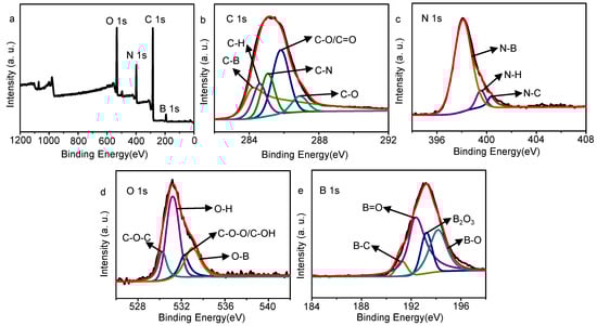 (a) Full X-ray photoelectron spectrum of o-GQDs, (b) C1S spectrum measured by X-ray photoelectron spectrum of o-GQDs, (c) N1s spectrum of o-GQDs, (d) O1s spectrum of o-GQDs, and (e) B1s spectrum of o-GQDs.