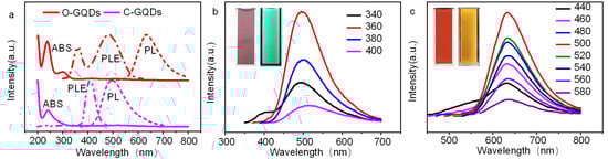 Figure 5a shows the ultraviolet absorption spectra and PL spectra of the two GQDs. The maximum absorption peaks of the c-GQDs and o-GQDs are 243 nm and 304 nm, respectively, which may be caused by the π–π* transition of the conjugated carbon–carbon double bond. As shown in the illustration in Figure 5b,c, the c-GQDs appear mauve under natural light, while o-GQDs appear brown under natural light. Under ultraviolet light, c-GQDs are cyan and o-GQDs are orange, indicating that after hydrothermal reaction, GQDs produce fluorescence. The best excitation wavelength of the c-GQDs is 360 nm and the best emission wavelength is 490 nm, while the best excitation wavelength of the o-GQDs is 480 nm and the best emission wavelength is 630 nm. As shown in Figure 5b,c, the fluorescence peak intensity of the c-GQDs and o-GQDs decreases or increases with the increase in the excitation wavelength, and the position of their peaks changes slightly, which may be due to the highly ordered graphite structure of the c-GQDs and o-GQDs; thus, the PL spectrum does not have excitation dependence.