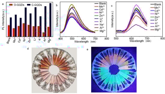 (a) The difference in the relative PL strengths of c-GQDs and o-GQDs between blank and solutions containing different metal ions, (b) Spectrograms of c-GQDs containing different metal ion solutions, (c) spectrograms of o-GQDs containing different metal ion solutions, and (d,e) photographs of c-GQDs and o-GQDs containing different metal ion solutions under natural light and ultraviolet light (the c-GQDs solution is lavender under natural light and cyan under UV light, and the o-GQDs solution is brown under natural light and orange under UV light).