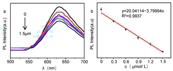 The fluorescence intensity of o-GQDs and their linear relationship with Al3+ concentration was tested for the mixed solution with Al3+ concentration increasing from 0 μM to 1.5 μM. As shown in Figure 7a, when the concentration of Al3+ ions increases from 0 μM to 1.5 μM, the fluorescence intensity of the o-GQDs solution at 480 nm gradually decreases. In addition, it can be seen from Figure 7b that there is a good linear relationship between the Al3+ ion concentration and the o-GQDs PL fluorescence intensity. The linear regression Equation (1) is: