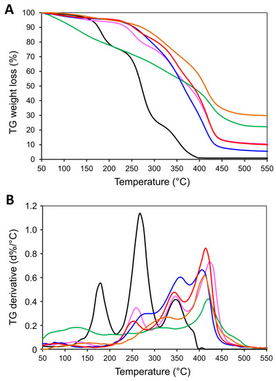 Figure 2. TGA (A) and DTG (B) of [P(EMA)-co-(GMA)] (black) [P(EMA)-co-(GMA)]-ETA(1) (purple), [P(EMA)-co-(GMA)]-Orn(1) (green), [P(EMA)-co-(GMA)]-Xyl (blue), [P(EMA)-co-(GMA)]-ETA(2) (red), and [P(EMA)-co-(GMA)]-Orn(2) (orange). Measurements were performed in an Ar atmosphere at a rate of 10 °C min−1.