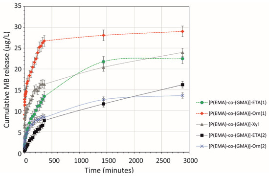 Figure 4. Release profiles of MB from the synthesized oligomers. Determination of the MB concentration was based on spectrophotometric analysis at λ = 633 nm.