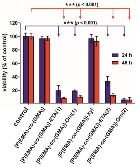 The cytotoxicity test showed the non-toxicity of only non-modified [P(EMA)-co-(GMA)] and [P(EMA)-co-(GMA)]-Xyl (Figure 5). Cells exposed to extracts of the mentioned oligomers exhibited high viability that was near 100% throughout the full length of the experiment. Other samples were characterized by high cytotoxicity since cell viability was significantly reduced to approx. 20% for [P(EMA)-co-(GMA)]-ETA(1) and [P(EMA)-co-(GMA)]-Orn(1), to 35% for [P(EMA)-co-(GMA)]-ETA(2) and to 7% for [P(EMA)-co-(GMA)]-Orn(2). Moreover, the extension of exposure time to 48 h resulted in a further reduction in cell viability.