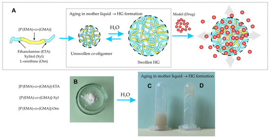 Here, chemical procedures for the formation of HGs containing ethyl methacrylate (EMA) and glycidyl methacrylate (GMA) monomers are presented. The oligomerization reaction leads to the formation of a random co-oligomer: poly[(ethyl methacrylate)-co-(glycidyl methacrylate)], [P(EMA)-co-(GMA)]. Their covalent functionalization with hydrophilic moieties leads to modification of the oligomeric chain, which makes it possible in the final stage to convert this hydrophobic oligomer into a 3D network of HGs. Additionally, the physico-chemical properties of the non-modified and the modified [P(EMA)-co-(GMA)] materials, the possibility of using them as a matrix for immobilizing model compound (drugs) and their cytotoxicity are presented.