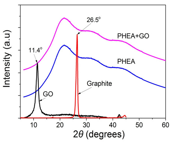 In order to identify the oxidation of graphite to graphite oxide and then its exfoliation to graphene oxide, as well as the presence of GO in the polymer matrix, XRD measurements were carried out for graphite, GO, neat PHEA, and the nanocomposites of PHEA and GO. From the XRD spectra shown in Figure 2, graphite shows a sharp peak at 26.5°. When it is transformed to graphite oxide this peak is shifted to 11.4°. This means that graphite has successfully oxidized to graphite oxide, and that the latter has been exfoliated to graphene oxide during ultrasonication. In neat PHEA, a broad distribution appears denoting the amorphous structure of the polymer. When GO was incorporated into the polymer matrix, the same spectra was recorded. Neither of the characteristic sharp peaks of graphite at 26.5° or graphite oxide at 11.4° appear. This is an indication that graphite oxide has been exfoliated into graphene oxide during the reaction, but, also, it could be attributed to the very low amount of GO used.