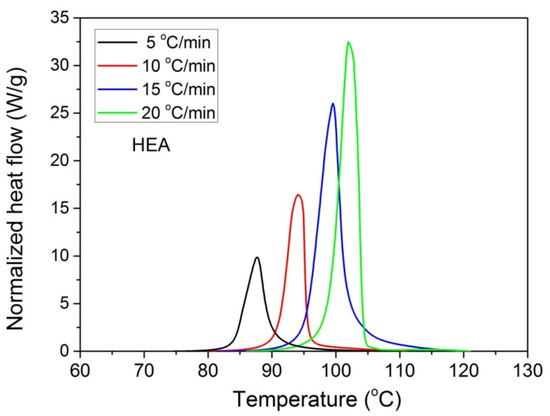 Polymerization rate, as measured by the heat release from DSC, vs. temperature, measured during non-isothermal polymerization of HEA at four heating rates.