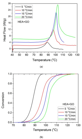 Furthermore, it was proposed to use non-isothermal kinetic experiments in order to investigate the effect of GO on the polymerization kinetics. Therefore, additional experiments were carried out at four heating rates from 5 to 20 °C/min. Results for both neat HEA and HEA in the presence of GO polymerization appear in Figure 7 and Figure 8a, respectively. As expected, an increase in the heating rate resulted in shifting of the reaction curves to higher temperatures. From integration of the polymerization rate curves the variation in monomer conversion with temperature this time was estimated, illustrated in Figure 8b. Polymerization starts near 80 °C at the lower heating rate (5 °C/min) and ends near 95 °C. At the high heating rate of 20 °C/min, polymerization starts and ends at 95 and 110 to 120 °C. A direct comparison between the polymerization rate profiles of neat HEA and HEA with GO appears in Figure 9. This shows that all curves measured with the addition of GO are broader compared to the corresponding curves without GO. Therefore, theoretical models were again used to address the polymerization kinetics. In non-isothermal experiments, isoconversional models are usually used to estimate the variation in the overall reaction activation energy with conversion [32]. Then, the general kinetic equation is written as