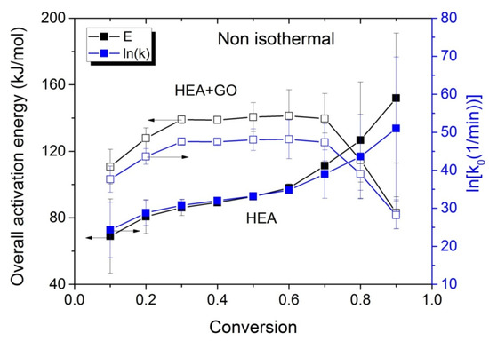At all temperatures investigated, the reaction time t at different conversion values is obtained from Figure 5 and such plots are created. From the slope of the straight line, the activation energy is estimated, whereas from the intercept the ln(Aeff) is estimated. Such plots were created for both neat HEA and the HEA with GO nanocomposites, and the values obtained are plotted as a function of conversion in Figure 6.