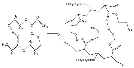 The isothermal polymerization results of neat HEA can be explained in a similar way to PHEMA polymerization at the same reaction temperatures. The interpretation of these results can be carried out in terms of specific interactions and, in particular, the formation of intra- and inter-chain hydrogen bonds between the monomer and the polymer molecules. Accordingly, since the monomer, 2-hydroxyethyl acrylate, contains one hydroxyl (–OH) and one carbonyl (C=O) group on its molecule, the latter can act only as the proton acceptor, while the OH group could act as both the proton donor and acceptor [31,33]. Hydrogen bonding between the monomer hydroxyl group and carbonyl oxygen atom strengthens the positive partial charges at the carbonyl C atom and at the double bond, as shown schematically in Figure 11, leading to a significant charge transfer in the transition state of propagation [31]. During polymerization, both intra- and inter-chain hydrogen bonding between the monomer and polymer molecules may take place and, in the polymer structure, both OH---OH and C=O---HO types of hydrogen bonds can occur (Figure 11).