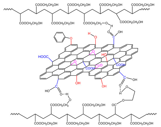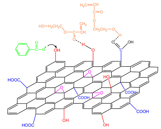 When GO is added in the polymerizing mixture, the surface hydroxyl and carboxyl groups could have a double role: the formation of hydrogen bonds with the monomer molecule as well as reacting with the primary initiator radicals (Figure 12). The latter, as shown in our previous publications [19,20,21,22], leads to a reduction in the initiator efficiency and, as a result, to a retardation of the reaction.