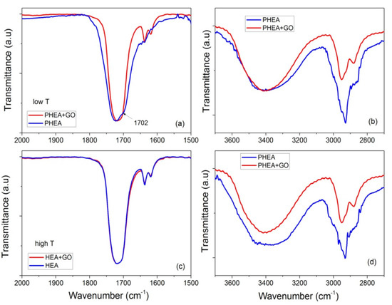 FTIR-ATR spectra focusing on the regions 2000–1500 and 3700–2700 cm−1, of neat PHEA and PHEA + GO obtained at low temperature (i.e., 60 °C (a,b)) or high temperature (i.e., 80 °C (c,d)).