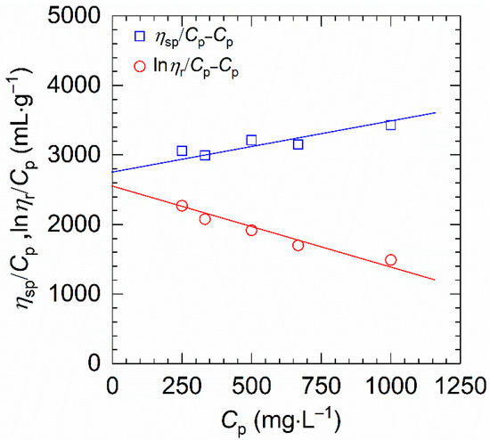 On the other hand, owing to the high viscosity and ionic groups, the common methods such as gel permeation chromatography and static light scattering are not appropriate for measuring the molecular weight of HVFR [28]. Thus, we used the conventional viscometry to determine the molecular weight. Figure 3 exhibits the reduced viscosity (ηsp/Cp) and inherent viscosity (lnηr/Cp) against polymer concentration (Cp). One can find that both ηsp/Cp and lnηr/Cp present a good linear dependence on the polymer concentration, indicating better fittings of the two equations and an accurate determination of [η]. The value of [η] for HVFR obtained by averaging the intersections of both plots is 2710 mL⋅g−1. Therefore, the viscosity-average molecular weight (Mη) of the HVFR calculated from [η] through Mark−Houwink relationship is 23.2 × 106 g⋅mol−1. Moreover, the resulting [η] can be used to suggest the overlap concentration, C*, which is defined as C* ≈ 1/[η]. In this work, the overlap concentration investigated is calculated to be 369 mg⋅L−1 for HVFR.