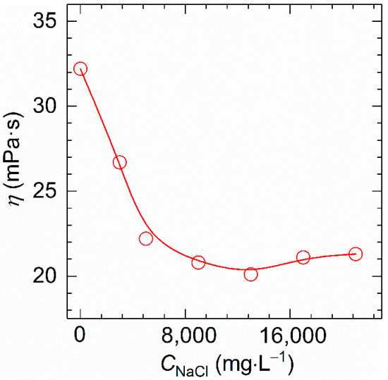 Next, the viscosity of polymer solution with 1700 mg⋅L−1 polymer concentration was observed at 30 °C and 170 s−1 at different NaCl concentrations ranging from 0 to 2.1 × 104 mg⋅L−1. As shown in Figure 7, the viscosity of HVFR stays at a high level while changing sharply when increasing the CNaCl to 13,000 mg⋅L−1, and a slight augmentation in viscosity was seen with a further increase of the CNaCl to 21,000 mg⋅L−1. Since HVFR contains carboxylate groups, it behaves as a typical anionic polyelectrolyte, very sensitive to the presence of cations. Consequently, the viscosity of HVFR solution would be decreased owing to the screening of the electrostatic repulsions among the polymer chains. The explanation for salt-induced viscosifying behavior is connected to the fact that ions shield the repulsive intermolecular interactions to facilitate the formation of hydrogen bonds between the compact polymer chains [17,37]. In summary, at concentration of 1700 mg⋅L−1, HVFR solution shows 67% viscosity retention rate after heating from 30 to 90 °C, and the viscosity retention rate of HVFR solution when increasing CNaCl to 21,000 mg⋅L−1 is 66%. Consequently, HVFR exhibits acceptable thermal stability and salt tolerance.