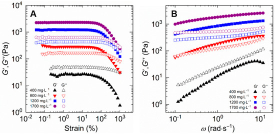 Figure 8A compares the viscoelastic characteristics of HVFR solution from strain sweep experiment with polymer concentration altering from 400 to 1700 mg⋅L−1 at 30 °C and an angular frequency (ω) of 6.28 rad⋅s−1, with strain ranging from 0.01 to 100%. The HVFR solutions exhibit the same shape for storage modulus (G′) and loss modulus (G″) on oscillatory strain (γ) at all polymer concentrations. At 0.01% < γ < 100%, the G′ and G″ independent of γ are observed, which reflects a linear viscoelastic region. The constant values of G′ and G″ within this linear viscoelastic region indicate that the network structure of HVFR is intact and changes inconspicuously with varied γ. When γ is above 100%, both G′ and G″ gradually decrease with γ, implying the disentanglement and orientation of polymer chains of HVFR at high γ. Besides, as HVFR concentration increases, both G′ and G″ accordingly increase, demonstrating concentrated HVFR solutions exhibit more significant viscoelasticity than its low polymer concentration counterparts. Nevertheless, the values of G′ at HVFR concentration ranging from 800 to 1700 mg⋅L−1 are always higher than the G″ in the linear viscoelastic region, implying that these HVFR polymer solutions have elastic dominated behavior. Conversely, the G″ of 400 mg⋅L−1 HVFR polymer solution is greater than the G′, which shows the viscous predominate behavior. Here the polymer solutions can be separated into dilute and semi-dilute domains by overlapping concentration 369 mg⋅L−1 as mentioned above. In this respect, all employed HVFR concentrations are above the overlap concentration, falling in the semi-dilute regime. At polymer concentration of 400 mg⋅L−1, although entanglement between the polymer chains occurs, whereas the intermolecular interactions between the macromolecule chains are relative weak. These interactions are not sufficient to improve the viscoelasticity of the polymer solution, which is therefore predominantly viscous. With increasing polymer concentration, there is a notable increase in intermolecular interactions and entanglements, resulting in the viscoelasticity of polymer solution transition from a predominantly viscous to an elastic response.
