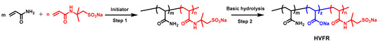 The HVFR was prepared by free radical polymerization in deionized water in an oxygen-free nitrogen atmosphere. The appropriate amounts of AM (95 g) and AMPS (5 g) were dissolved in deionized water (400 g) and the pH of the solution was adjusted to 7~8 by NaOH. Afterwards, the solution was transferred into a thermostatic container and the solution temperature was cooled to 10 °C under a continuous flow of nitrogen. Then the initiators including V044 (0.01 g), NaHSO3 (0.01 g), and (NH4)2S2O8 (0.01 g) dissolved in deionized water were slowly added into aforementioned solution. The polymerization was kept for 24 h to ensure a full reaction. After polymerization, the polymer was first added into a deionized water while stirring for about 5 h to ensure fully dissolution. Then, appropriate amounts of NaOH was dissolved into polymer solution. Next, the solution was heated to 80 °C and kept for 2 h. The final product was dried at 40 °C first, then dissolved in deionized water, followed by precipitation several times in excess of ethanol and was freeze-dried to obtain the final white powder. The reaction route is illustrated in Scheme 1.