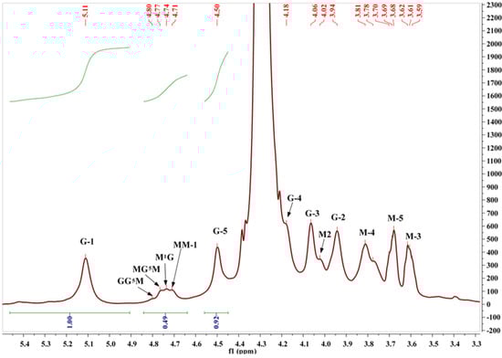 To characterize the composition and M/G ratio of the extracted alginate, the approach of Grasdalen was adopted []. The relative areas of the peak I at 5.11 ppm (guluronic anomeric proton G-1), peak II at 4.71 ppm (mannuronic anomeric proton M-1 and the C-5 of alternating blocks GM-5), and peak III at 4.50 ppm (H-5 guluronic residue G-5) encompass information on the uronic acid composition and fractions of nearest neighbors along the copolymer chain [,,] (Figure 4).