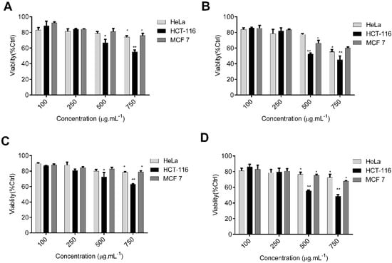 Cytotoxic effects of fucoidan and alginate on the viability of various cancer cells (HCT-116, MCF 7, and HeLa). Different concentrations of fucoidan on tumor cells were tested at 24 h (A) and 48 h (B). Cytotoxic potentials of alginate against these cancer cell lines were also examined at 24 h (C) and 48 h (D) (mean ± SD; n = 3). Significant differences are indicated as * p < 0.05 and ** p < 0.01 with respect to control.