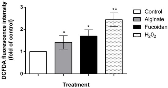 Fucoidan and alginate isolated from C. sinuosa trigger an increase in DCFDA fluorescence intensity, reflecting the enhanced ROS levels in HCT-116 colon cancer cells (mean ± SD; n = 3). Significant differences are indicated as * p < 0.05 and ** p < 0.01 with respect to control.