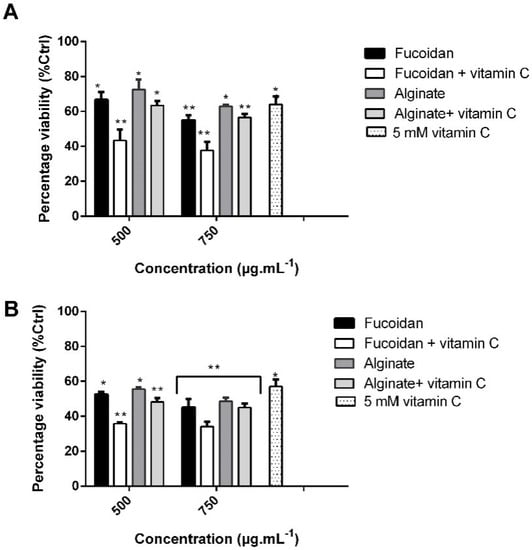 As shown in Figure 8B, the combination of 5 mM vitamin C with 750 µg/mL−1 of fucoidan at 48 h resulted in a significant reduction in cell viability (34.2%), in comparison to either compound alone (45 and 57% decrease in presence of fucoidan or vitamin C, respectively). The decrease in HCT-116 cell viability when treated with alginate and vitamin C was almost similar (45% at 48 h) to alginate treatment alone (48.6%). Thus, the combination of vitamin C with fucoidan appears to display a more potent antitumor effect than combining vitamin C with alginate.