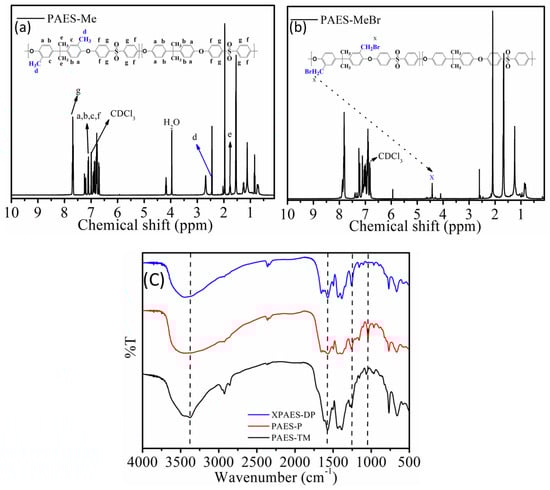 1H NMR spectra of (a) PAES-Me and (b) PAES-MeBr to confirm the stepwise functionalization of PAES, and (c) FT-IR spectra of three synthesized membranes, XPAES-DP, PAES-P, and PAES-TM.