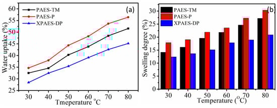 Water uptake and swelling ratio are important properties of the ion exchange membranes, as they significantly affect other membrane properties. In general, high water uptake enhances the ion conductivity but reduces the mechanical strength of the membrane. Thus, the establishment of high ion conductivity at low water uptake is highly pursued in the synthesis of ion exchange membranes in electrochemical applications, including fuel cells. The water uptake depends on the polymer backbone structure as well as the number and type of active functional groups attached on the polymer backbone. As shown in Figure 2a, the lowest water uptake of 28.44% at 30 °C is displayed by XPAES-DP membrane because of the internal cross-linking via the formation of covalent bonds between the polymer chains. This network structure prohibits the accommodation of a large amount of water molecules and thus results in relatively low water uptake without significant loss of mechanical strength of the membrane. The highest water uptake 34.65% at 30 °C and 56.42% at 80 °C are observed from PAES-P membrane. The higher water behavior of PAES-P than PAES-TM is caused by the hydrophilicity difference between the two functional groups, P and TM. The same trend is observed for the swelling ratio of the membranes as depicted in Figure 2b. Even though XPAES-DP has more quaternary ammonium groups than PAES-TM and PAES-P membranes, its swelling ratio is the lowest because cross-linked molecular structures tend to restrict the expansion of polymer volume. This dimensional stability associated with the low swelling ratio is another advantageous membrane property directly affecting the long-term based cell performance.