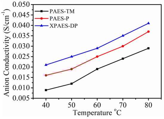 The hydroxide ion conductivity of the synthesized membranes under 100% relative humidity is presented as a function of temperature in Figure 3. For all membrane samples, the conductivity increased with the temperature because of the enhancement of kinetic motion of the anion under more water uptake at a higher temperature. The highest conductivity was shown by XPAES-DP membrane at all temperatures. Quite high anionic conductivity of 0.023 S cm−1 was achieved at quite low water uptake of 28.44% at 40 °C. It can be stated that the mobility of the hydroxide ions becomes enhanced in the presence of more quaternary ammonium groups acting as anion carriers for anion hopping. Moreover, the ionic clusters formed by the branched cross-linked structure in the polymer backbone could lead to the formation of ionic channels for facile anion transport by vehicular mechanism. The lower basicity of cyclic-alkyl rings than the conjugated ones would also be another factor for enhanced anion conductivity. The presence of delocalized π-electrons in aromatic ring tends to increase the basicity of the system so that the anions may suffer from the repulsive forces in their percolated path.