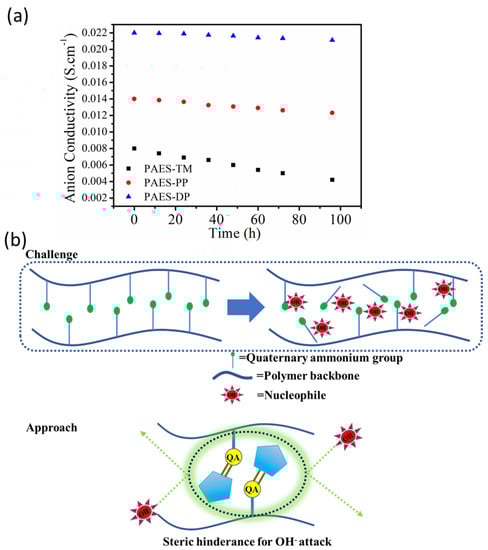 (a). Anion conductivity of the membrane as a function of time in alkaline solution and (b) the possible mechanism associated with the steric hindrance effect against nucleophiles by the bulky functional groups.