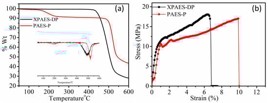 (a) Thermal degradation (dTg in inset) and (b) tensile stress vs. strain behavior for XPAES-DP and PAES-P membranes.