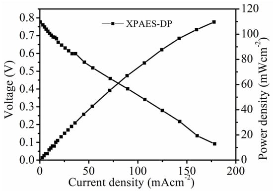 The single-cell test was performed at 80 °C under 100% relative humidity for the XPAES-DP membrane. The open circuit voltage was 0.78 V and the maximum power density was109 mWcm−2, respectively, as shown in Figure 6. As, the quaternary ammonium groups attached on the crosslinked chains act as a chemically stable medium for anion transportation during cell test, the cell displays a very slow rate of voltage drop with increasing current density.
