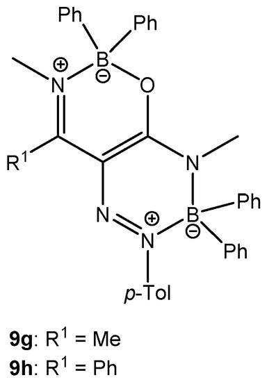 Additionally, the products of double coordination of BPh3 (9g and 9h, Figure 5) were isolated in the case of the reaction of enaminoamides 1g and 1h with diazonium tetraphenylborate carried out in dichloromethane at room temperature (Method A) for 72 h and 96 h, respectively. The yield was 4% for 9g and 15% for 9h. Compound 9h was also obtained using the Method C (refluxing the mixture for 3 h), but the yield was only 3%. Chemical shifts of 11B and 15N are similar to those for oxazaborine 6h and triazaborinone 5h. The study of this type of structure will be the subject of further investigation.