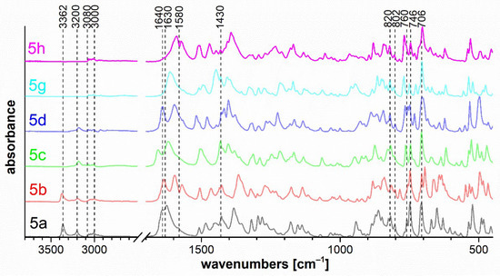 The set of measured IR spectra for triazaborinones 5 is depicted in Figure 7, for oxazaborines 6 in Figure 8, for diazaborinones 7 in Figure 9, and for triazaborines 8 and oxazaborine–triazaborines 9 in Figure 10. Weak stretching vibrations of the C–H bonds of aromatic benzene rings at 3080–3000 cm−1 are evident in all spectra. Next, it is possible to mention the adjacent H–H out-of-plane deformation at the para-substituted ring at 820 cm−1 and several strong vibrations of the monosubstituted benzene ring, the out-of-plane ring bending at 706 cm−1, and the adjacent H–H out-of-plane deformation at 746 cm−1.