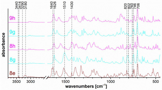 FTIR ATR spectra of triazaborines 8e, 8g, and 8h, and oxazaborine–triazaborines 9g and 9h.